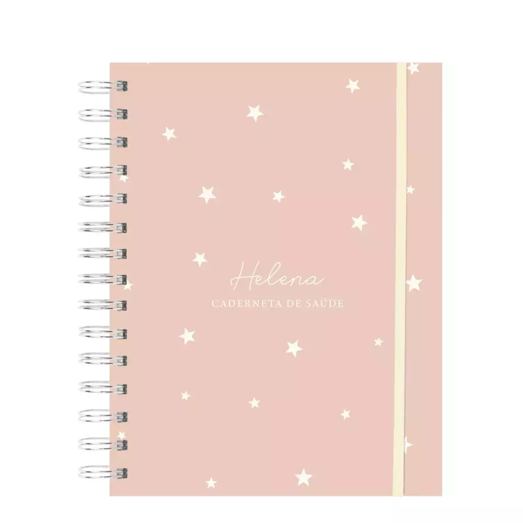 Fechamento com elástico com passante de acrílico dourado (Observação: a cor do elátisco e formato do passante serão escolhidos de acordo com o tema da capa)